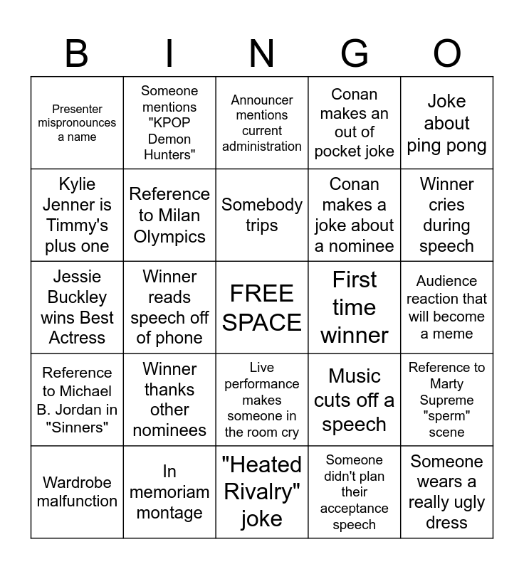 This bingo card has a free space and 27 words: Music cuts off a speech, Movie wins more than 3 awards, Conan makes a joke about a nominee, "Heated Rivalry" joke, Kylie Jenner is Timmy's plus one, Announcer mentions current administration, Someone mentions "KPOP Demon Hunters", Reference to Michael B. Jordan in "Sinners", First time winner, Reference to Marty Supreme "sperm" scene, Jessie Buckley wins Best Actress, Conan makes an out of pocket joke, Wardrobe malfunction, In memoriam montage, Winner cries during speech, Joke about Wicked snub, Reference to Milan Olympics, Somebody trips, Winner thanks other nominees, Presenter mispronounces a name, Audience reaction that will become a meme, Someone didn't plan their acceptance speech, Winner reads speech off of phone, Someone wears a really ugly dress, Live performance makes someone in the room cry, Joke about ping pong and Awkward pan to audience reaction.
