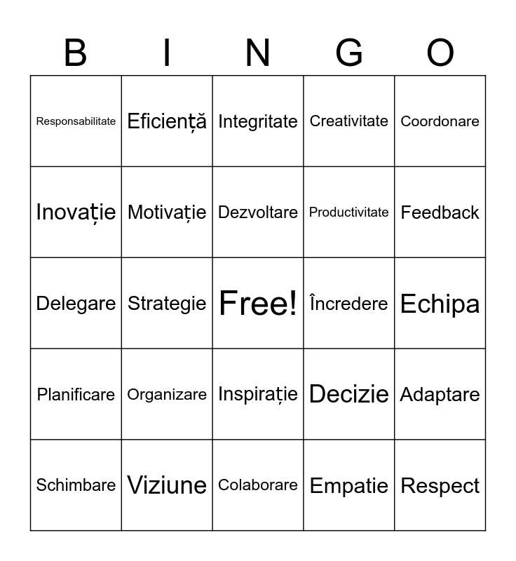 This bingo card has a free space and 30 words: Viziune, Misiune, Strategie, Leadership, Responsabilitate, Integritate, Motivație, Inspirație, Încredere, Colaborare, Echipa, Respect, Empatie, Comunicare, Feedback, Ascultare, Decizie, Planificare, Organizare, Coordonare, Delegare, Priorități, Eficiență, Productivitate, Inovație, Creativitate, Adaptare, Schimbare, Dezvoltare and Valori.