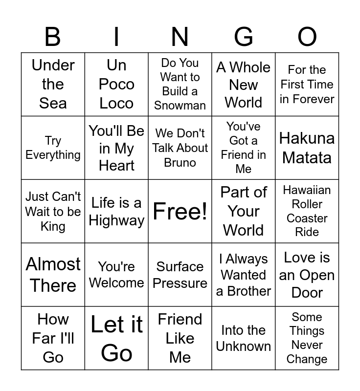 This bingo card has a free space and 24 words: You're Welcome, Let it Go, We Don't Talk About Bruno, How Far I'll Go, For the First Time in Forever, Under the Sea, Try Everything, Un Poco Loco, Part of Your World, Surface Pressure, You've Got a Friend in Me, Just Can't Wait to be King, I Always Wanted a Brother, Love is an Open Door, You'll Be in My Heart, Into the Unknown, Hawaiian Roller Coaster Ride, Do You Want to Build a Snowman, Hakuna Matata, Life is a Highway, Some Things Never Change, Almost There, A Whole New World and Friend Like Me.
