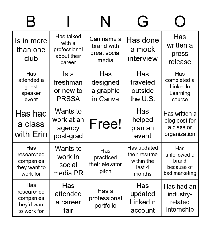 This bingo card has a free space and 24 words: Wants to work in social media PR, Has attended a career fair, Has designed a graphic in Canva, Has researched companies they’d want to work for, Has written a press release, Is in more than one club, Has attended a guest speaker event, Has talked with a professional about their career, Has helped plan an event, Has practiced their elevator pitch, Has traveled outside the U.S., Has had a class with Erin, Has updated their resume within the last 4 months, Has unfollowed a brand because of bad marketing, Is a freshman or new to PRSSA, Has updated LinkedIn account, Has written a blog post for a class or organization, Can name a brand with great social media, Has completed a LinkedIn Learning course, Wants to work at an agency post-grad, Has had an industry-related internship, Has researched companies they want to work for, Has done a mock interview and Has a professional portfolio.