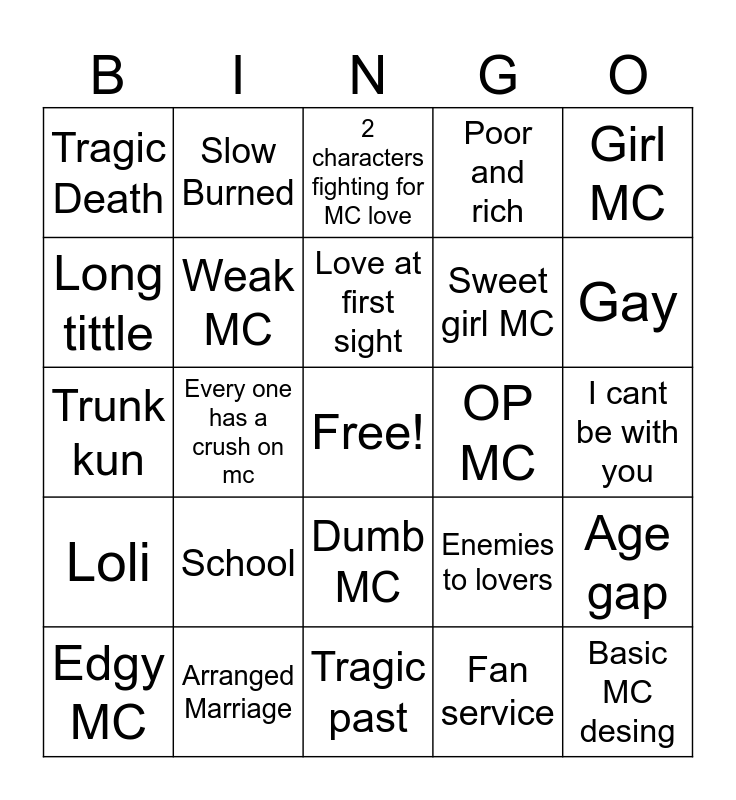 This bingo card has a free space and 24 words: School, Arranged Marriage, Love at first sight, Edgy MC, Girl MC, Tragic Death, Long tittle, Slow Burned, OP MC, Dumb MC, Sweet girl MC, Trunk kun, Enemies to lovers, Age gap, Weak MC, Fan service, I cant be with you, 2 characters fighting for MC love, Gay, Every one has a crush on mc, Basic MC desing, Loli, Poor and rich and Tragic past.