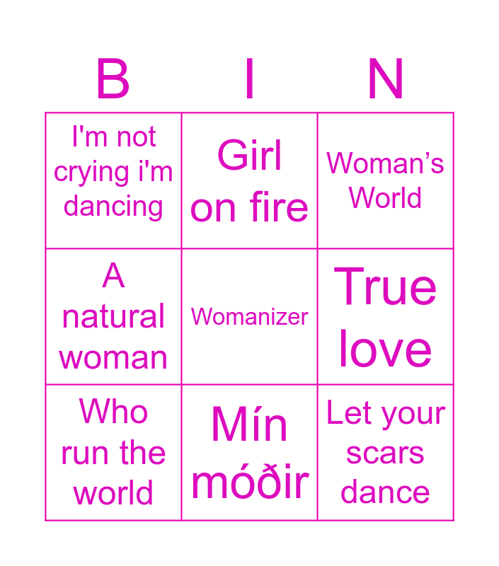 This bingo card has a free space and 11 words: God is a woman, Mín móðir, Let your scars dance, Who run the world, Girl on fire, Woman’s World, True love, Red Lips, A natural woman, I'm not crying i'm dancing and Frøknur.