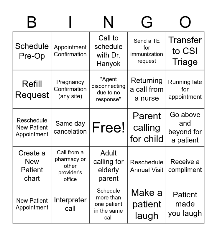 This bingo card has a free space and 24 words: Call from a pharmacy or other provider's office, Interpreter call, "Agent disconnecting due to no response", New Patient Appointment, Transfer to CSI Triage, Schedule Pre-Op, Refill Request, Appointment Confirmation, Parent calling for child, Adult calling for elderly parent, Returning a call from a nurse, Reschedule New Patient Appointment, Reschedule Annual Visit, Receive a compliment, Pregnancy Confirmation (any site), Make a patient laugh, Go above and beyond for a patient, Call to schedule with Dr. Hanyok, Running late for appointment, Same day cancelation, Patient made you laugh, Create a New Patient chart, Send a TE for immunization request and Schedule more than one patient in the same call.