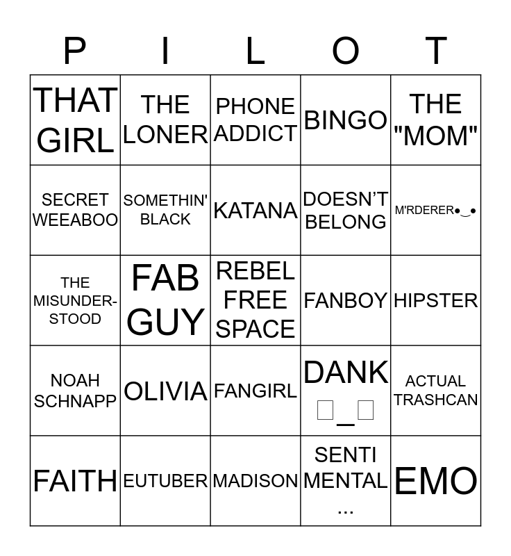 This bingo card has 25 words: OLIVIA, MADISON, KATANA, FAITH, THE "MOM", THAT GIRL, SECRET WEEABOO, THE LONER, FANBOY, FANGIRL, DOESN’T BELONG, THE MISUNDER-STOOD, DANK 〠_〠, ACTUAL TRASHCAN, SOMETHIN' BLACK, EMO, HIPSTER, PHONE ADDICT, M'RDERER●‿●, FAB GUY, REBEL FREE SPACE, EUTUBER, NOAH SCHNAPP, BINGO and SENTI MENTAL ....