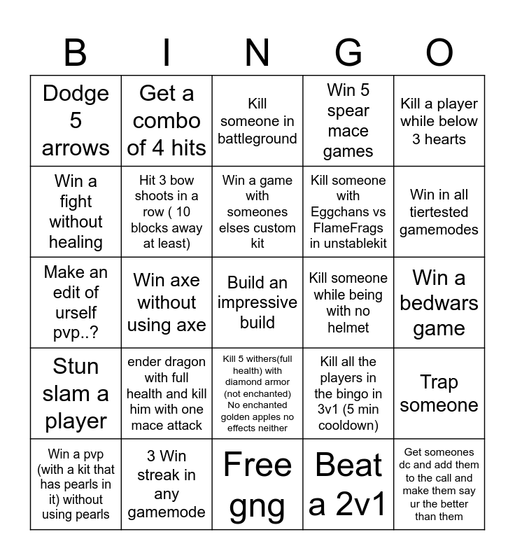 This bingo card has 25 words: Stun slam a player, 3 Win streak in any gamemode, Build an impressive build, Beat a 2v1, Kill a player while below 3 hearts, Dodge 5 arrows, Get a combo of 4 hits, Kill someone in battleground, Kill someone while being with no helmet, Trap someone, Win a fight without healing, Hit 3 bow shoots in a row ( 10 blocks away at least), Free gng, Kill all the players in the bingo in 3v1 (5 min cooldown), Win in all tiertested gamemodes, Win a pvp (with a kit that has pearls in it) without using pearls, Win axe without using axe, Win a game with someones elses custom kit, Kill someone with Eggchans vs FlameFrags in unstablekit, Win a bedwars game, Make an edit of urself pvp..?, ender dragon with full health and kill him with one mace attack, Kill 5 withers(full health) with diamond armor (not enchanted) No enchanted golden apples no effects neither, Win 5 spear mace games and Get someones dc and add them to the call and make them say ur the better than them.
