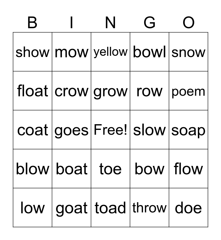 This bingo card has a free space and 24 words: boat, goat, grow, low, snow, show, float, mow, slow, toe, row, coat, bow, flow, crow, throw, soap, yellow, poem, goes, doe, blow, bowl and toad.
