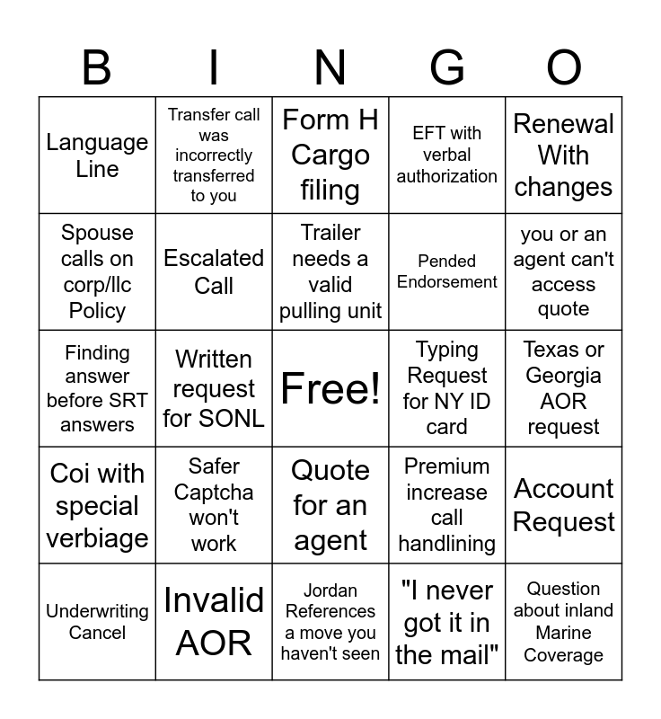 This bingo card has a free space and 24 words: Safer Captcha won't work, Invalid AOR, Trailer needs a valid pulling unit, Underwriting Cancel, Renewal With changes, Language Line, Spouse calls on corp/llc Policy, Transfer call was incorrectly transferred to you, Typing Request for NY ID card, Quote for an agent, Pended Endorsement, Finding answer before SRT answers, Premium increase call handlining, Account Request, Escalated Call, "I never got it in the mail", Texas or Georgia AOR request, Form H Cargo filing, you or an agent can't access quote, Written request for SONL, Question about inland Marine Coverage, Coi with special verbiage, EFT with verbal authorization and Jordan References a move you haven't seen.