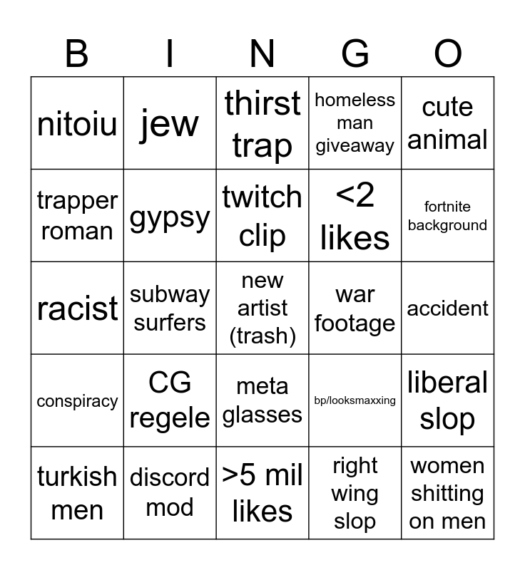 This bingo card has a free space and 24 words: CG regele, discord mod, twitch clip, turkish men, cute animal, nitoiu, trapper roman, jew, war footage, meta glasses, <2 likes, racist, bp/looksmaxxing, liberal slop, gypsy, right wing slop, accident, thirst trap, fortnite background, subway surfers, women shitting on men, conspiracy, homeless man giveaway and >5 mil likes.