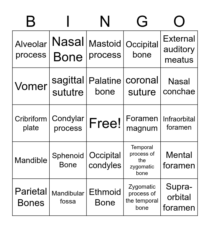 This bingo card has a free space and 45 words: Frontal Bone, Supra-orbital foramen, Frontal sinuses, Parietal Bones, Temporal Bones, Zygomatic process of the temporal bone, Mastoid process, Styloid process, External auditory meatus, Mandibular fossa, Occipital bone, Foramen magnum, Occipital condyles, Sphenoid Bone, Sella turcica, Ethmoid Bone, Perpendicular plate, Cribriform plate, Crista galli, Nasal conchae, Nasal Bone, Maxilla, Site of maxilla sinuses, Alveolar process, Palatine process of the maxilla, Infraorbital foramen, Incisive foramen, Zygomatic bones, Temporal process of the zygomatic bone, Mandible, Mandible Body, Mental foramen, Ramus, Angle, Coronoid process, Condylar process, Mandibular notch, Alveolar process, Lacrimal bones, Palatine bone, Vomer, coronal suture, lambdoid suture, sagittal sututre and squamous suture.