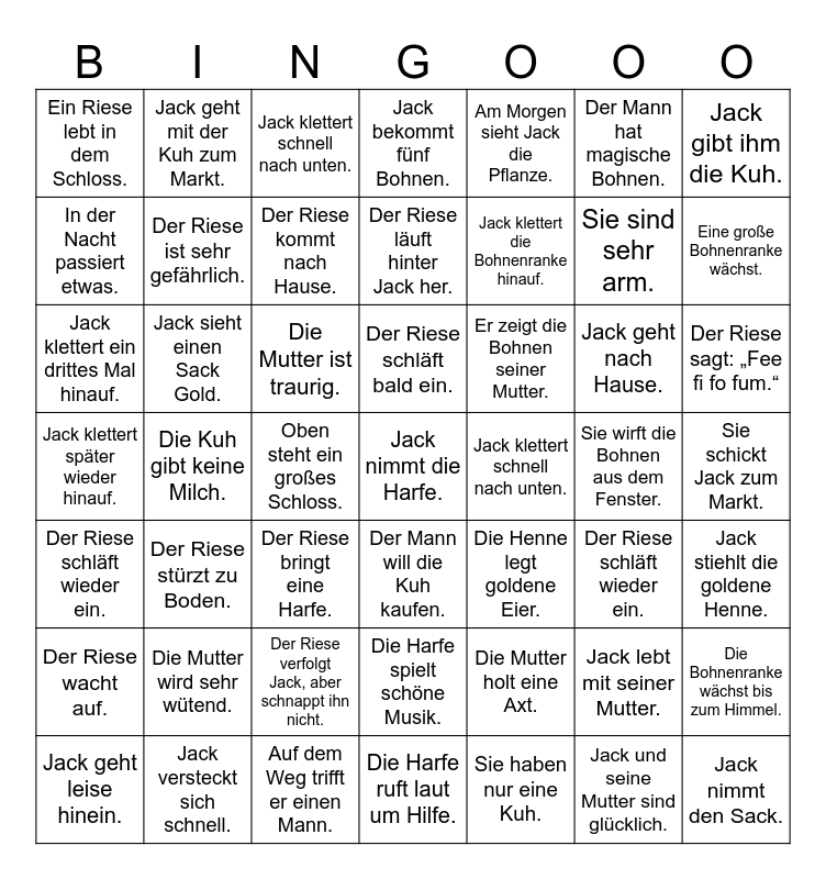 This bingo card has 49 words: Jack lebt mit seiner Mutter., Sie sind sehr arm., Sie haben nur eine Kuh., Die Kuh gibt keine Milch., Die Mutter ist traurig., Sie schickt Jack zum Markt., Jack geht mit der Kuh zum Markt., Auf dem Weg trifft er einen Mann., Der Mann hat magische Bohnen., Der Mann will die Kuh kaufen., Jack gibt ihm die Kuh., Jack bekommt fünf Bohnen., Jack geht nach Hause., Er zeigt die Bohnen seiner Mutter., Die Mutter wird sehr wütend., Sie wirft die Bohnen aus dem Fenster., In der Nacht passiert etwas., Eine große Bohnenranke wächst., Die Bohnenranke wächst bis zum Himmel., Am Morgen sieht Jack die Pflanze., Jack klettert die Bohnenranke hinauf., Oben steht ein großes Schloss., Ein Riese lebt in dem Schloss., Der Riese ist sehr gefährlich., Jack geht leise hinein., Der Riese kommt nach Hause., Der Riese sagt: „Fee fi fo fum.“, Jack versteckt sich schnell., Der Riese schläft bald ein., Jack sieht einen Sack Gold., Jack nimmt den Sack., Jack klettert schnell nach unten., Der Riese wacht auf., Der Riese verfolgt Jack, aber schnappt ihn nicht., Jack klettert später wieder hinauf., Die Henne legt goldene Eier., Der Riese schläft wieder ein., Jack stiehlt die goldene Henne., Jack klettert ein drittes Mal hinauf., Der Riese bringt eine Harfe., Die Harfe spielt schöne Musik., Der Riese schläft wieder ein., Jack nimmt die Harfe., Die Harfe ruft laut um Hilfe., Der Riese läuft hinter Jack her., Jack klettert schnell nach unten., Die Mutter holt eine Axt., Der Riese stürzt zu Boden. and Jack und seine Mutter sind glücklich..