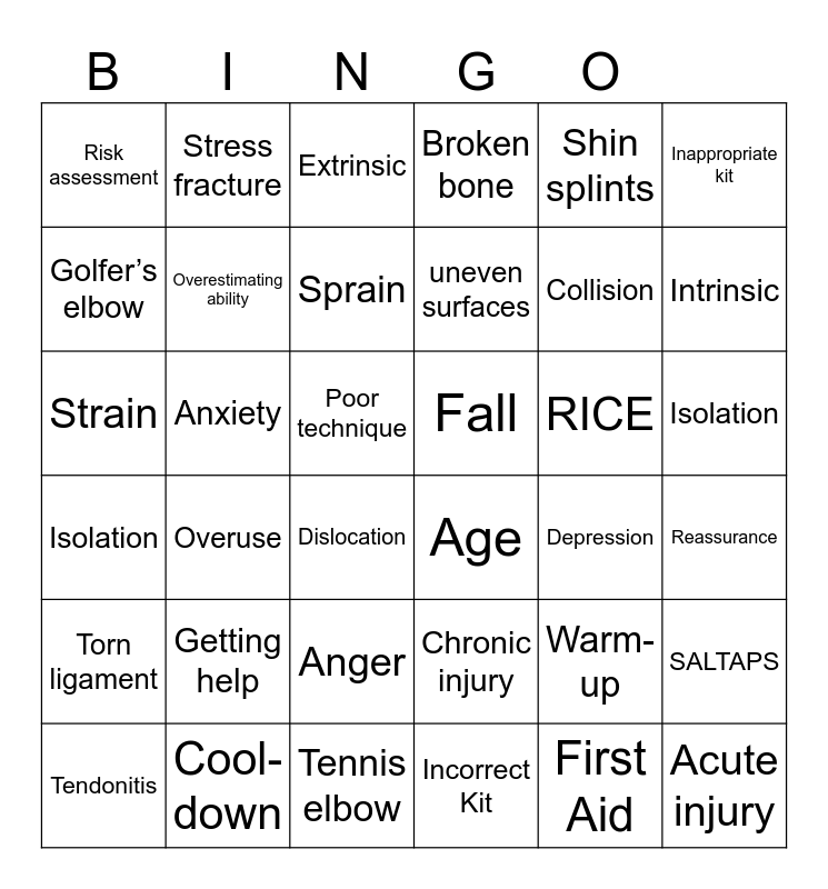 This bingo card has 36 words: Chronic injury, Anger, Incorrect Kit, Golfer’s elbow, Isolation, Fall, Overestimating ability, Tennis elbow, Shin splints, Warm-up, Intrinsic, Broken bone, SALTAPS, Anxiety, uneven surfaces, Risk assessment, Torn ligament, RICE, Strain, Extrinsic, Poor technique, Overuse, Age, Dislocation, Depression, Stress fracture, Collision, Cool-down, Sprain, Inappropriate kit, Acute injury, Tendonitis, Reassurance, Isolation, Getting help and First Aid.