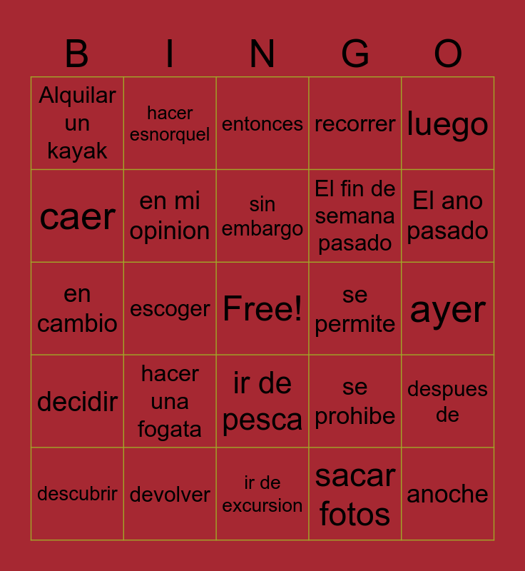This bingo card has a free space and 32 words: Acampar, devolver, ir de excursion, pasear en bote, El ano pasado, Alquilar un kayak, escoger, ir de pesca, recorrer, anoche, caer, hacer esnorquel, sacar fotos, antes(de), decidir, hacer una caminata, El lago, se permite, ayer, descubrir, hacer una fogata, observar las estrellas, se prohibe, despues de, en cambio, en mi opinion, entonces, El fin de semana pasado, luego, por ultimo, primero and sin embargo.