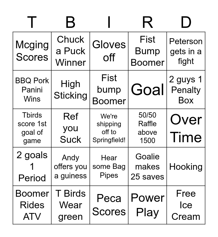 This bingo card has a free space and 24 words: Andy offers you a guiness, T Birds Wear green, Fist bump Boomer, Boomer Rides ATV, Peterson gets in a fight, Mcging Scores, BBQ Pork Panini Wins, Chuck a Puck Winner, 50/50 Raffle above 1500, Hear some Bag Pipes, Goal, Tbirds score 1st goal of game, Goalie makes 25 saves, Hooking, High Sticking, Power Play, Over Time, Gloves off, 2 guys 1 Penalty Box, Ref you Suck, Free Ice Cream, 2 goals 1 Period, Fist Bump Boomer and Peca Scores.