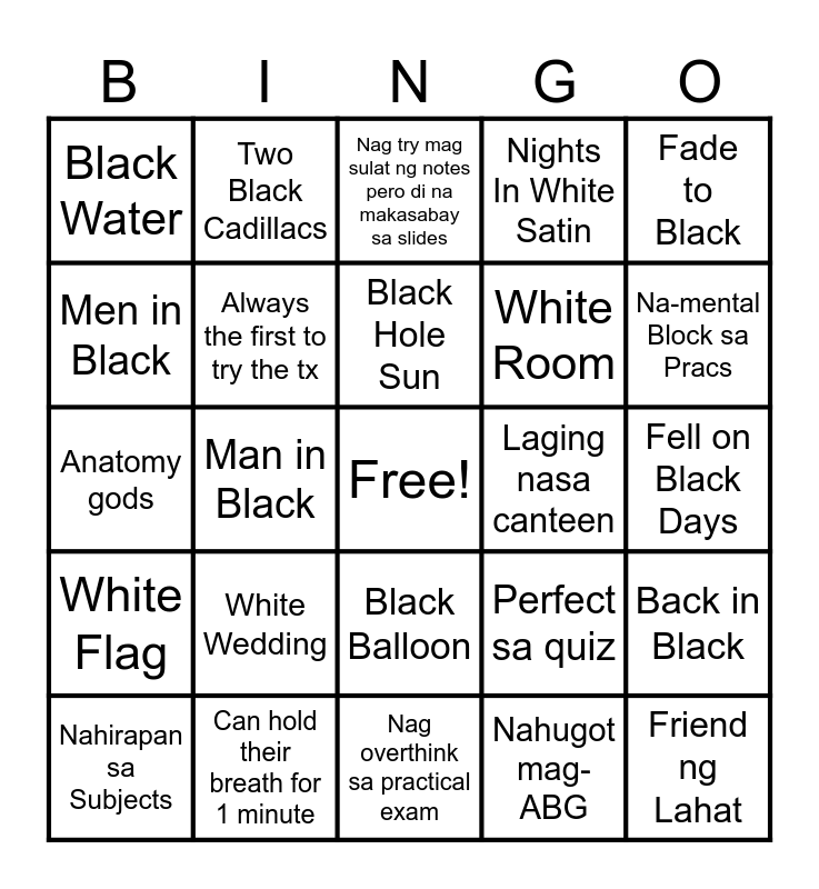 This bingo card has a free space and 64 words: Black Velvet, Black or White, Paint it Black, Back in Black, Back to Black, Black Cadillac, Two Black Cadillacs, Black Horse and the Cherry Tree, Black Hole Sun, Black, Black Balloon, Welcome to the Black Parade, Fell on Black Days, Fade to Black, Black and Yellow, Men in Black, Man in Black, Black Water, Black Widow, White Room, White Wedding, White Flag, Nights In White Satin, White Lightning, Nag group study pero naging chikahan, Enjoys your Course, Has Favorite Prof, Natutulog sa Class, Laging puyat, Confident sa mga pracs at retdem, Felt Nevous before Exam, Pumasok na antok, umuwing kumpleto sa tulog, May crush na Prof, Laging may Coffee, Na-mental Block sa Pracs, Nahirapan sa Subjects, Na-Zero sa quiz, Nahugot mag-ABG, Book worm, Always the first to try the tx, Anatomy gods, Laging nasa canteen, May crush sa classmate/other year, Practice-an ng classmates sa ROM/ MMT, Dreaming of tx plans, Friend ng Lahat, Can hold their breath for 1 minute, IE gods, Perfect sa quiz, Human manikin, Nag cram ng review night before exam, Nagka mental block sa recitation, Nag overthink sa practical exam, "Highlight the important" : naging coloring book, Nag nod kahit hindi fully gets, Nag compare ng sagot after exam, Nag try mag sulat ng notes pero di na makasabay sa slides, Nag whisper sa katabi: “Anong slide na tayo?”, Nag copy ng notes ng classmate kasi kulang notes, Nag tanong sa group chat: “May assignment ba?”, Nag “ahh gets ko na” moment sa difficult topic, Nag memorize ng muscles pero halo halo na sa utak, Nag review gamit mnemonics and Nag “bawi na lang next exam” mindset.