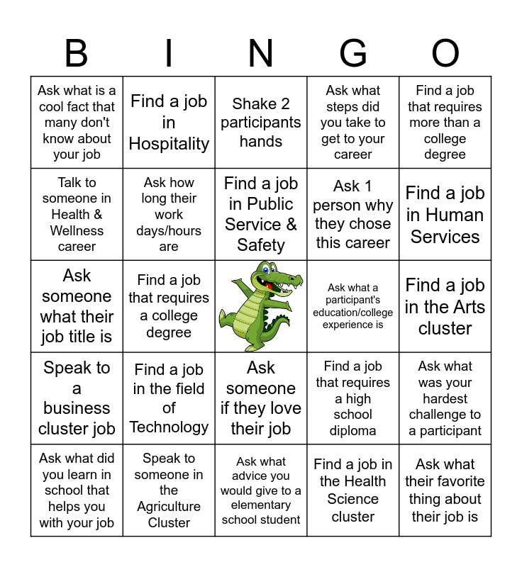 This bingo card has a free space and 24 words: Find a job in the field of Technology, Speak to someone in the Agriculture Cluster, Find a job in Public Service & Safety, Ask what did you learn in school that helps you with your job, Find a job that requires more than a college degree, Ask what is a cool fact that many don't know about your job, Talk to someone in Health & Wellness career, Find a job in Hospitality, Ask what a participant's education/college experience is, Ask someone if they love their job, Ask 1 person why they chose this career, Ask someone what their job title is, Find a job that requires a high school diploma, Ask what was your hardest challenge to a participant, Ask how long their work days/hours are, Find a job in the Health Science cluster, Find a job in the Arts cluster, Shake 2 participants hands, Find a job in Human Services, Find a job that requires a college degree, Ask what their favorite thing about their job is, Speak to a business cluster job, Ask what steps did you take to get to your career and Ask what advice you would give to a elementary school student.