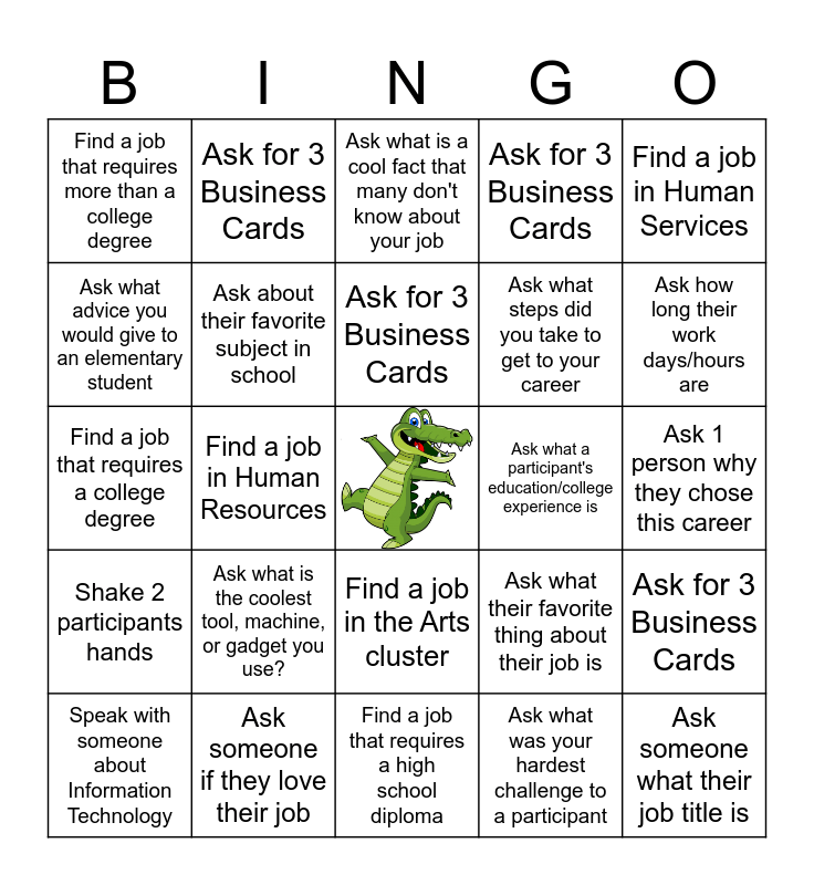 This bingo card has a free space and 29 words: Speak with someone about Information Technology, Speak to someone in the Agriculture Cluster, Find a job in Human Resources, Ask what did you learn in school that helps you with your job, Find a job that requires more than a college degree, Ask what is a cool fact that many don't know about your job, Ask about their favorite subject in school, Ask what is the coolest tool, machine, or gadget you use?, Ask what a participant's education/college experience is, Ask someone if they love their job, Ask 1 person why they chose this career, Ask someone what their job title is, Find a job that requires a high school diploma, Ask what was your hardest challenge to a participant, Ask how long their work days/hours are, Find a job in the Health Science cluster, Find a job in the Arts cluster, Shake 2 participants hands, Find a job in Human Services, Find a job that requires a college degree, Ask what their favorite thing about their job is, Speak to a business cluster job, Ask what steps did you take to get to your career, Ask what advice you would give to an elementary student, Ask for 3 Business Cards, Ask for 3 Business Cards, Ask for 3 Business Cards, Ask for 3 Business Cards and Ask for 3 Business Cards.