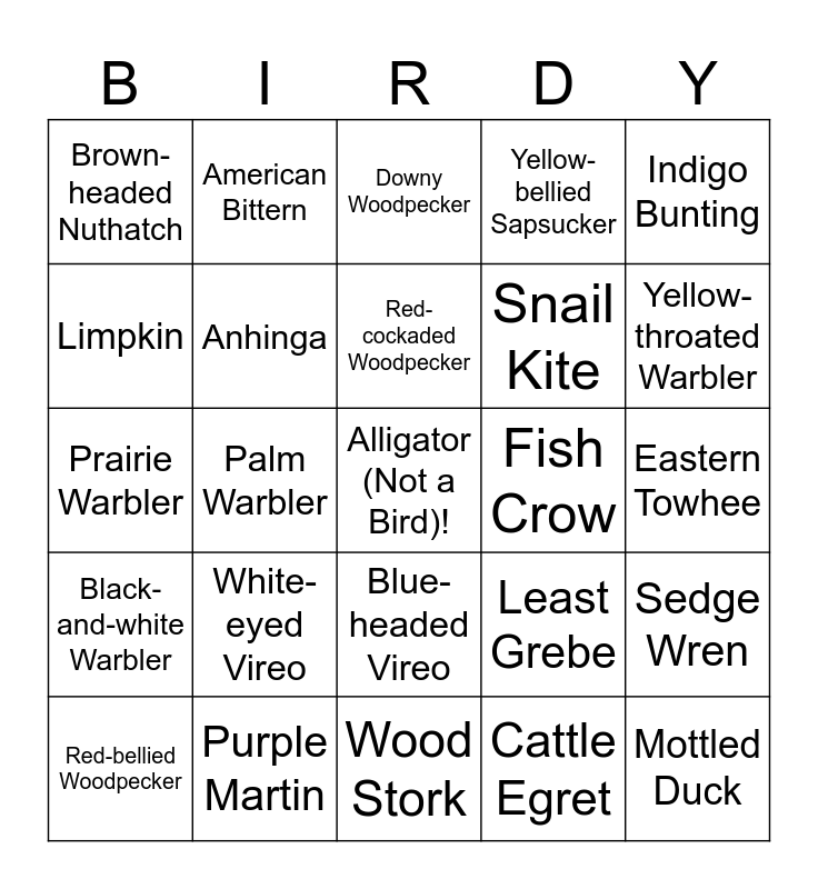 This bingo card has a free space and 29 words: Red-bellied Woodpecker, Pine Warbler, Palm Warbler, Sandhill Crane, Brown-headed Nuthatch, Downy Woodpecker, Anhinga, White-eyed Vireo, Fish Crow, Purple Martin, Eastern Towhee, Mottled Duck, Wood Stork, Cattle Egret, Yellow-throated Warbler, Eastern Meadowlark, Blue-headed Vireo, Black-and-white Warbler, Indigo Bunting, Prairie Warbler, Least Grebe, King Rail, Snail Kite, Limpkin, Yellow-bellied Sapsucker, American Bittern, Sedge Wren, Red-cockaded Woodpecker and Bachman's Sparrow.