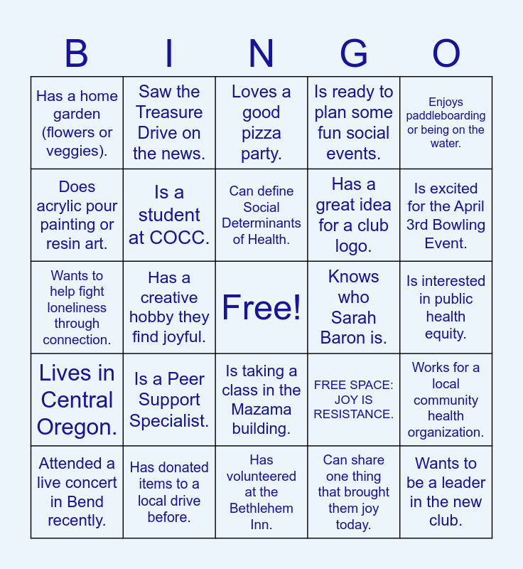 This bingo card has a free space and 25 words: Is a Peer Support Specialist., Has volunteered at the Bethlehem Inn., Can define Social Determinants of Health., Attended a live concert in Bend recently., Enjoys paddleboarding or being on the water., Has a home garden (flowers or veggies)., Does acrylic pour painting or resin art., Saw the Treasure Drive on the news., Knows who Sarah Baron is., Is taking a class in the Mazama building., Has a great idea for a club logo., Wants to help fight loneliness through connection., FREE SPACE: JOY IS RESISTANCE., Works for a local community health organization., Is a student at COCC., Has a favorite local hiking trail., Is interested in public health equity., Loves a good pizza party., Is excited for the April 3rd Bowling Event., Has a creative hobby they find joyful., Wants to be a leader in the new club., Has donated items to a local drive before., Lives in Central Oregon., Is ready to plan some fun social events. and Can share one thing that brought them joy today..