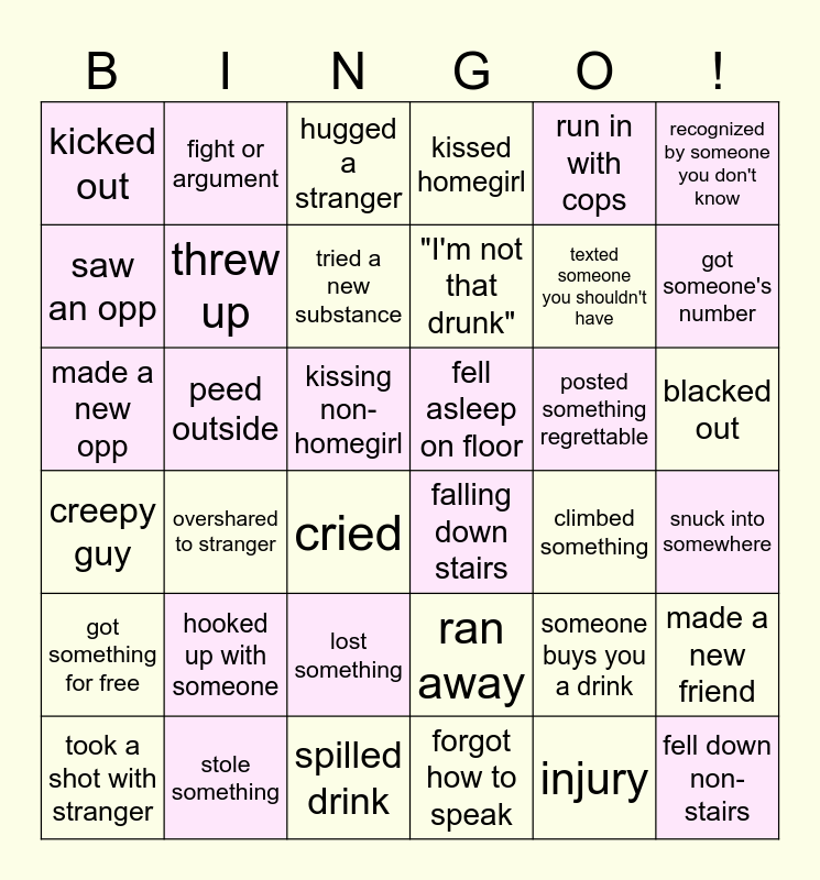 This bingo card has 36 words: ran away, lost something, forgot how to speak, saw an opp, creepy guy, fell asleep on floor, threw up, spilled drink, run in with cops, someone buys you a drink, got someone's number, kissed homegirl, made a new friend, peed outside, "I'm not that drunk", kicked out, got something for free, posted something regrettable, made a new opp, hugged a stranger, kissing non-homegirl, overshared to stranger, falling down stairs, cried, climbed something, fight or argument, texted someone you shouldn't have, stole something, tried a new substance, recognized by someone you don't know, fell down non-stairs, took a shot with stranger, snuck into somewhere, blacked out, hooked up with someone and injury.