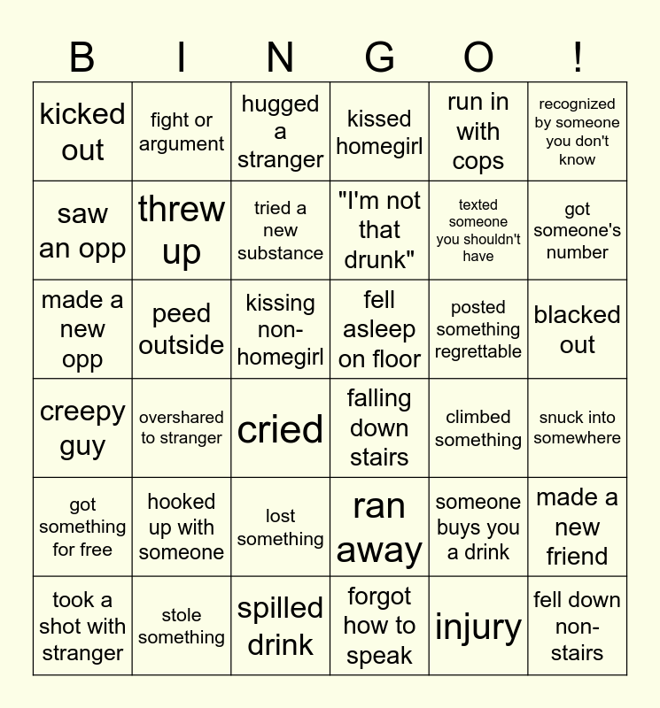 This bingo card has 36 words: ran away, lost something, forgot how to speak, saw an opp, creepy guy, fell asleep on floor, threw up, spilled drink, run in with cops, someone buys you a drink, got someone's number, kissed homegirl, made a new friend, peed outside, "I'm not that drunk", kicked out, got something for free, posted something regrettable, made a new opp, hugged a stranger, kissing non-homegirl, overshared to stranger, falling down stairs, cried, climbed something, fight or argument, texted someone you shouldn't have, stole something, tried a new substance, recognized by someone you don't know, fell down non-stairs, took a shot with stranger, snuck into somewhere, blacked out, hooked up with someone and injury.