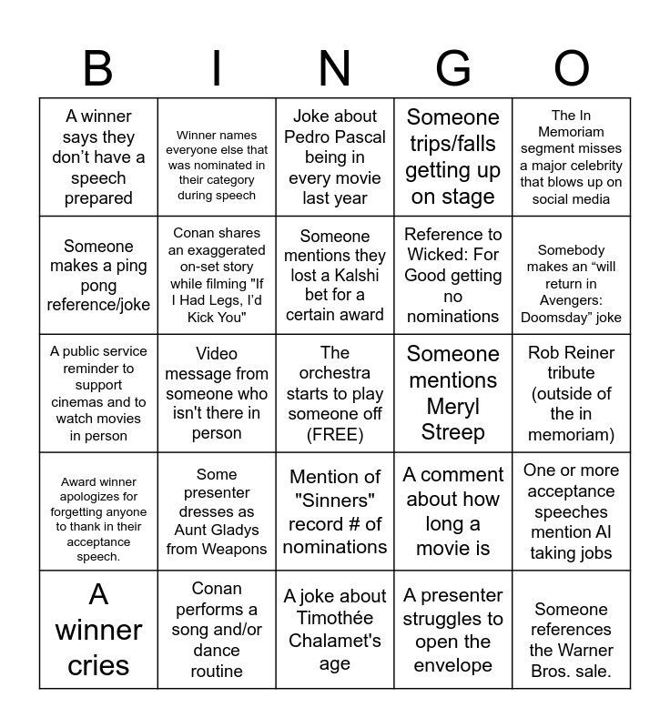 This bingo card has a free space and 24 words: Some presenter dresses as Aunt Gladys from Weapons, Conan performs a song and/or dance routine, Someone mentions they lost a Kalshi bet for a certain award, A winner cries, The In Memoriam segment misses a major celebrity that blows up on social media, A winner says they don’t have a speech prepared, Someone makes a ping pong reference/joke, Winner names everyone else that was nominated in their category during speech, Someone mentions Meryl Streep, Mention of "Sinners" record # of nominations, Reference to Wicked: For Good getting no nominations, A public service reminder to support cinemas and to watch movies in person, A comment about how long a movie is, One or more acceptance speeches mention AI taking jobs, Conan shares an exaggerated on-set story while filming "If I Had Legs, I’d Kick You", A presenter struggles to open the envelope, Rob Reiner tribute (outside of the in memoriam), Joke about Pedro Pascal being in every movie last year, Somebody makes an “will return in Avengers: Doomsday” joke, Video message from someone who isn't there in person, Someone references the Warner Bros. sale., Award winner apologizes for forgetting anyone to thank in their acceptance speech., Someone trips/falls getting up on stage and A joke about Timothée Chalamet's age.