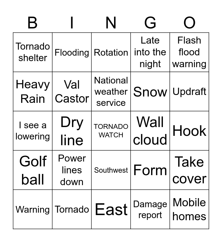 This bingo card has a free space and 62 words: T-Storm, Tornado, Hail stones, Golf ball, Tennis ball, Pea sized, Val Castor, Damon Lane, Snow, Rainbow, Late into the night, Hail core, Heavy Rain, Spin up, Safety, Tornado shelter, Mobile homes, Flash flood warning, Doppler radar, National weather service, Wall cloud, Rotation, Warning, Damage report, Fast moving, Supercell, Lightning, Expired, Take cover, Stay with us, Watch, Use caution, Bearing down, Wind shear, Hook, Flooding, Rain wrapped, Portable radio, Dry line, On the ground, I see a lowering, Power flashes, Power lines down, Debris cloud, Updraft, Form, I-40, I-35, South, Southeast, Southwest, East, West, North, Northwest, Northeast, Might, Area of concern, Power outage, I-44, Earthquake and Threat.