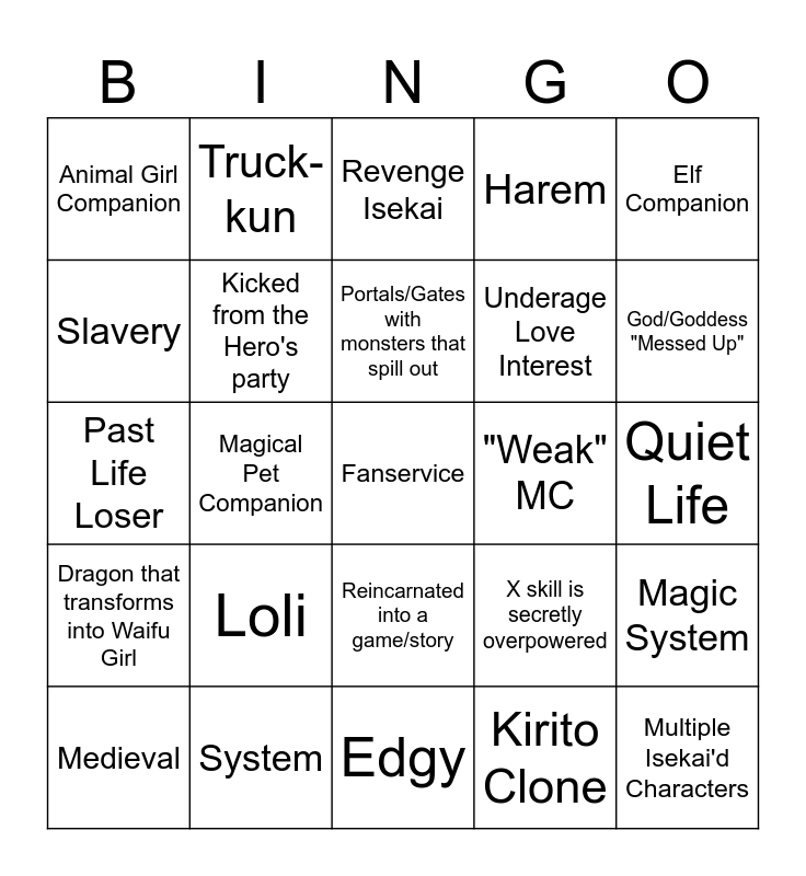 This bingo card has a free space and 24 words: Loli, System, Portals/Gates with monsters that spill out, Medieval, Elf Companion, Animal Girl Companion, Slavery, Truck-kun, "Weak" MC, Reincarnated into a game/story, Underage Love Interest, Past Life Loser, X skill is secretly overpowered, Magic System, Kicked from the Hero's party, Kirito Clone, Quiet Life, Revenge Isekai, God/Goddess "Messed Up", Magical Pet Companion, Multiple Isekai'd Characters, Dragon that transforms into Waifu Girl, Harem and Edgy.