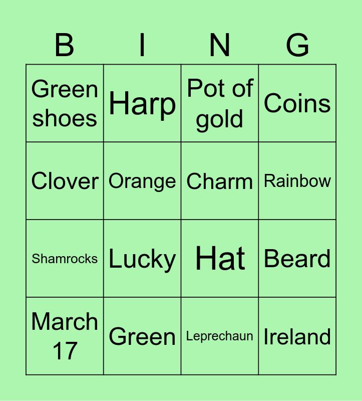 This bingo card has 16 words: March 17, Green, Pot of gold, Coins, Clover, Harp, Hat, Beard, Green shoes, Orange, Leprechaun, Rainbow, Shamrocks, Lucky, Charm and Ireland.