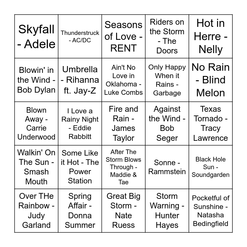This bingo card has 62 words: Here Comes the Sun - The Beatles, Spring Affair - Donna Summer, Walking on Sunshine - Katrina & The Waves, Walkin' On The Sun - Smash Mouth, Pocketful of Sunshine - Natasha Bedingfield, Island in the Sun - Weezer, Umbrella - Rihanna ft. Jay-Z, Rain on Me - Lady Gaga and Ariana Grande, Only Happy When it Rains - Garbage, Thunder - Imagine Dragons, Riders on the Storm - The Doors, Dust in the Wind - Kansas, Blowin' in the Wind - Bob Dylan, Rock You Like a Hurricane - Scorpions, Summer Breeze - Seals and Crofts, Skyfall - Adele, Fire and Rain - James Taylor, Hot in Herre - Nelly, Tornado - Little Big Town, Ain't No Love in Oklahoma - Luke Combs, Against the Wind - Bob Seger, Seasons of Love - RENT, Over THe Rainbow - Judy Garland, Storm Warning - Hunter Hayes, Weatherman - Hank Williams Jr., September - Earth, Wind & Fire, Perfect Storm - Brad Paisley, I Can See Clearly Now - Johnny Nash, Black Hole Sun - Soundgarden, Beautiful Day - U2, Snowbird - Anne Murray, Spring Again - Biz Markie, Can You Stand the Rain - New Edition, Windy - The Association, Texas Tornado - Tracy Lawrence, Thunderstruck - AC/DC, Lightning Crashes - Live, The Winds of Change - St. Lucia, I Love a Rainy Night - Eddie Rabbitt, It's Raining Men - The Weather Girls, Blown Away - Carrie Underwood, Heat of the Moment - Asia, Some Like it Hot - The Power Station, The Heat Is On - Glenn Frey, No Rain - Blind Melon, Sonne - Rammstein, Rainbow Connection - Jim Henson, (Love Is Like A) Heat Wave - Martha & The Vandellas, After The Hurricane - Jazmine Sullivan, Sure Got Cold After the Rain Fell - ZZ Top, After The Storm Blows Through - Maddie & Tae, Great Big Storm - Nate Ruess, Colors of the Wind - Judy Kuhn, Wind Beneath My Wings - Bette Midler, Summer Nights - John Travolta and Olivia Newton-John, Solar Power - Lorde, I Will Follow You Into the Dark - Death Cab for Cutie, Hail, Hail - Pearl Jam, Just Say Yes - Snow Patrol, Informer - Snow, Tornado Warnings - Sabrina Carpenter and Weather Change - Tanya Stephens.