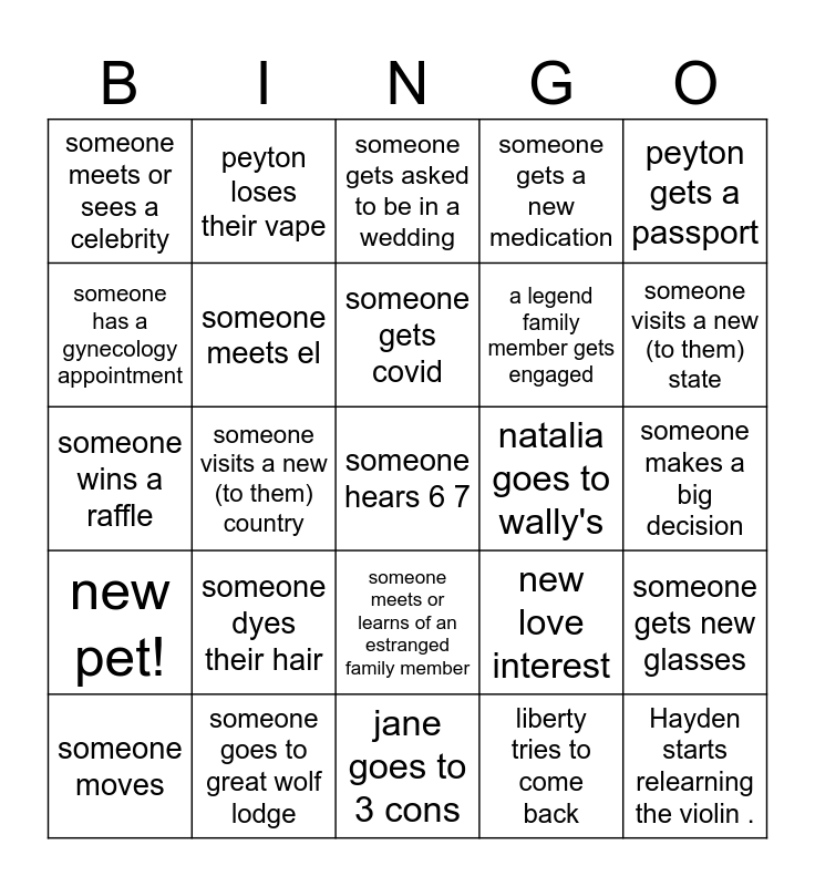 This bingo card has a free space and 34 words: the return of annie, liberty tries to come back, the end of sarah and nolan, pet health scare.., new pet!, someone meets el, peyton gets a passport, someone moves, peyton loses their vape, hayden loses his vape, someone gets covid, someone gets asked to be in a wedding, someone gets an STD, someone makes a viral tiktok, natalia goes to wally's, someone visits a new (to them) state, someone goes to great wolf lodge, someone wins a raffle, someone dyes their hair, new love interest, someone meets or learns of an estranged family member, julia sees a broadway show, someone meets or sees a celebrity, someone makes a big decision, jane goes to 3 cons, Hayden starts relearning the violin ., someone gets a new medication, someone is reached out to by an old friend (defining this as haven't talked in at least 2 years), a legend family member gets engaged, someone has a gynecology appointment, someone gets a new job, someone visits a new (to them) country, someone gets new glasses and someone takes a flight.