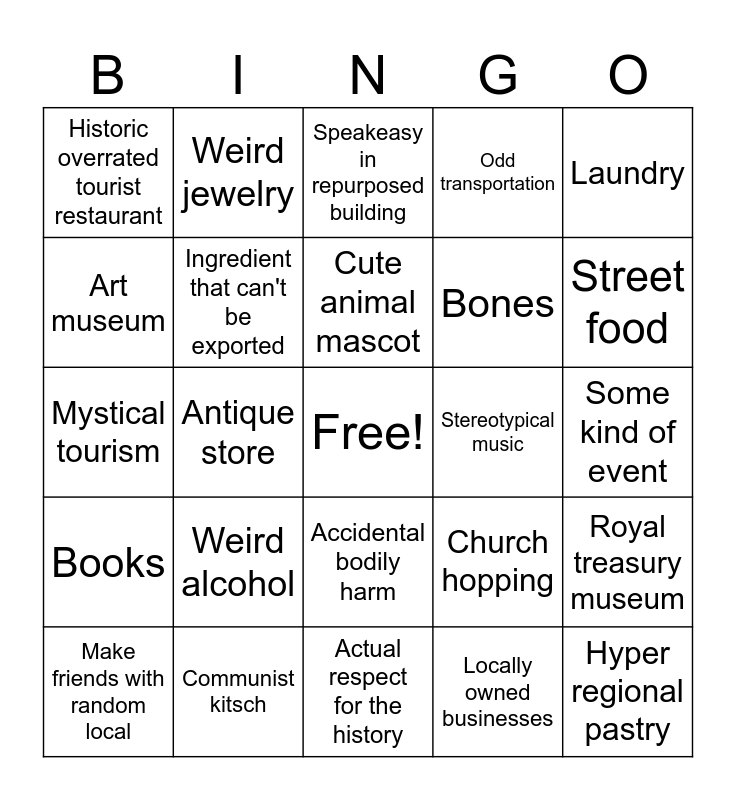 This bingo card has a free space and 24 words: Weird alcohol, Communist kitsch, Cute animal mascot, Make friends with random local, Laundry, Historic overrated tourist restaurant, Art museum, Weird jewelry, Stereotypical music, Accidental bodily harm, Bones, Mystical tourism, Church hopping, Royal treasury museum, Ingredient that can't be exported, Locally owned businesses, Some kind of event, Speakeasy in repurposed building, Street food, Antique store, Hyper regional pastry, Books, Odd transportation and Actual respect for the history.