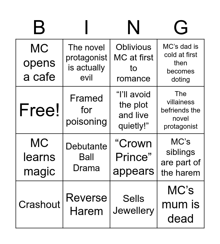 This bingo card has 16 words: Reverse Harem, MC’s siblings are part of the harem, Oblivious MC at first to romance, MC opens a cafe, MC learns magic, The novel protagonist is actually evil, “Crown Prince” appears, Sells Jewellery, Free!, Framed for poisoning, Crashout, MC’s dad is cold at first then becomes doting, Debutante Ball Drama, The villainess befriends the novel protagonist, “I’ll avoid the plot and live quietly!” and MC’s mum is dead.