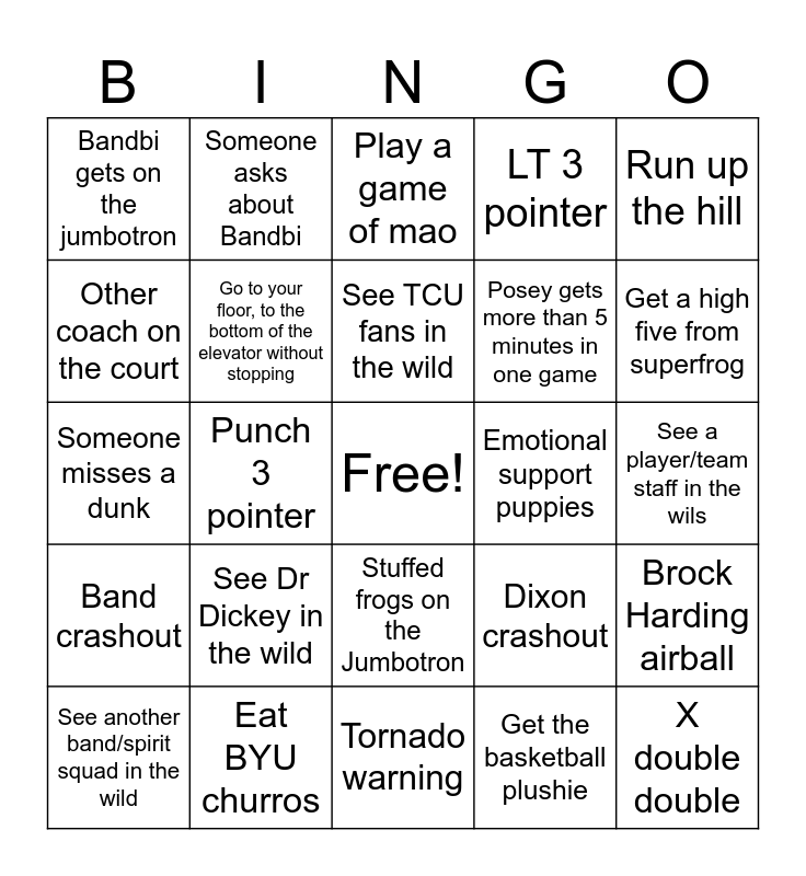 This bingo card has a free space and 24 words: See Dr Dickey in the wild, Eat BYU churros, See TCU fans in the wild, See another band/spirit squad in the wild, Run up the hill, Bandbi gets on the jumbotron, Other coach on the court, Someone asks about Bandbi, Emotional support puppies, Stuffed frogs on the Jumbotron, Posey gets more than 5 minutes in one game, Someone misses a dunk, Dixon crashout, Brock Harding airball, Go to your floor, to the bottom of the elevator without stopping, Get the basketball plushie, See a player/team staff in the wils, Play a game of mao, Get a high five from superfrog, Punch 3 pointer, X double double, Band crashout, LT 3 pointer and Tornado warning.