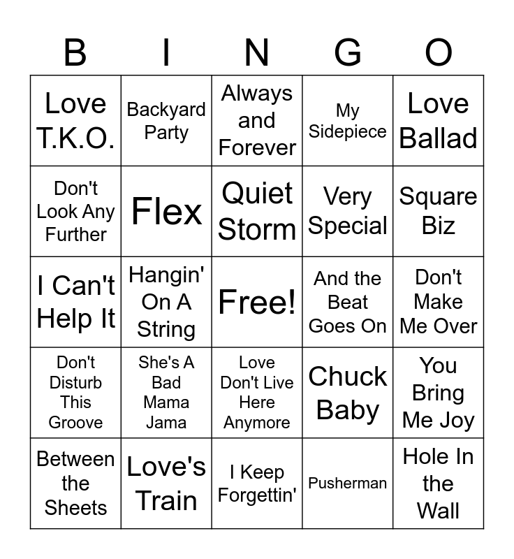 This bingo card has a free space and 24 words: She's A Bad Mama Jama, Love's Train, Quiet Storm, Between the Sheets, Love Ballad, Love T.K.O., Don't Look Any Further, Backyard Party, And the Beat Goes On, Love Don't Live Here Anymore, Very Special, I Can't Help It, Chuck Baby, You Bring Me Joy, Flex, Pusherman, Don't Make Me Over, Always and Forever, Square Biz, Hangin' On A String, Hole In the Wall, Don't Disturb This Groove, My Sidepiece and I Keep Forgettin'.