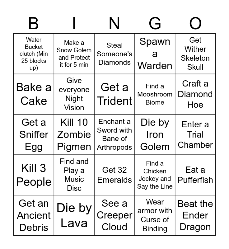 This bingo card has 25 words: Kill 3 People, Die by Lava, Enchant a Sword with Bane of Arthropods, Wear armor with Curse of Binding, Get Wither Skeleton Skull, Water Bucket clutch (Min 25 blocks up), Make a Snow Golem and Protect it for 5 min, Steal Someone's Diamonds, Die by Iron Golem, Eat a Pufferfish, Bake a Cake, Give everyone Night Vision, See a Creeper Cloud, Find a Chicken Jockey and Say the Line, Craft a Diamond Hoe, Get an Ancient Debris, Kill 10 Zombie Pigmen, Get a Trident, Find a Mooshroom Biome, Enter a Trial Chamber, Get a Sniffer Egg, Find and Play a Music Disc, Get 32 Emeralds, Spawn a Warden and Beat the Ender Dragon.