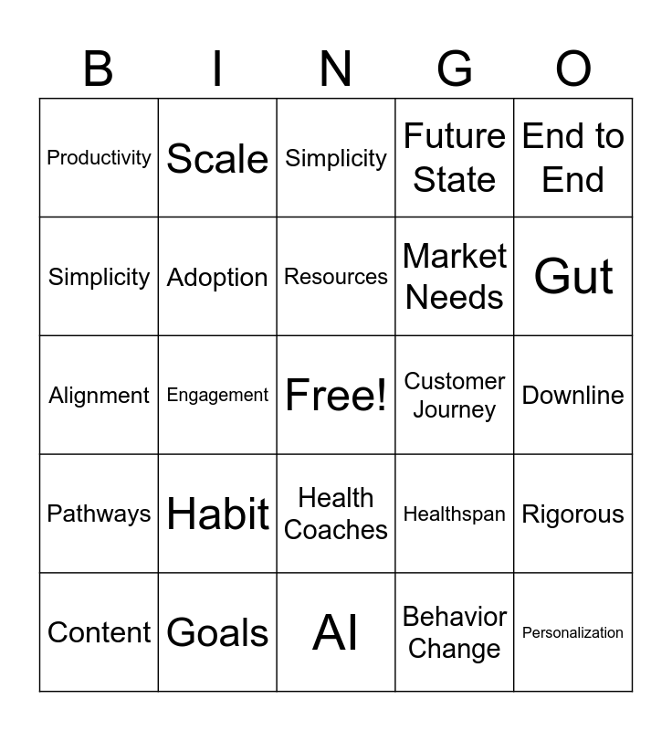 This bingo card has a free space and 31 words: AI, Ecosystem, Engagement, Community, Productivity, Simplicity, Adoption, Healthspan, Customer Journey, Behavior Change, Downline, Personalization, Capability, Insights, Gut, Portfolio, Rigorous, Habit, Pathways, Health Coaches, End to End, Core, Content, Scale, Market Needs, Simplicity, Future State, Alignment, Goals, Resources and Participants.
