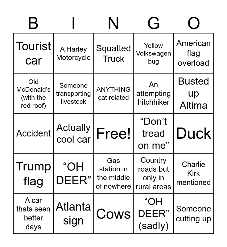 This bingo card has a free space and 24 words: “OH DEER”, Atlanta sign, ANYTHING cat related, A car thats seen better days, American flag overload, Tourist car, Old McDonald’s (with the red roof), A Harley Motorcycle, “Don’t tread on me”, Gas station in the middle of nowhere, An attempting hitchhiker, Accident, Country roads but only in rural areas, Charlie Kirk mentioned, Someone transporting livestock, “OH DEER” (sadly), Duck, Squatted Truck, Busted up Altima, Actually cool car, Someone cutting up, Trump flag, Yellow Volkswagen bug and Cows.