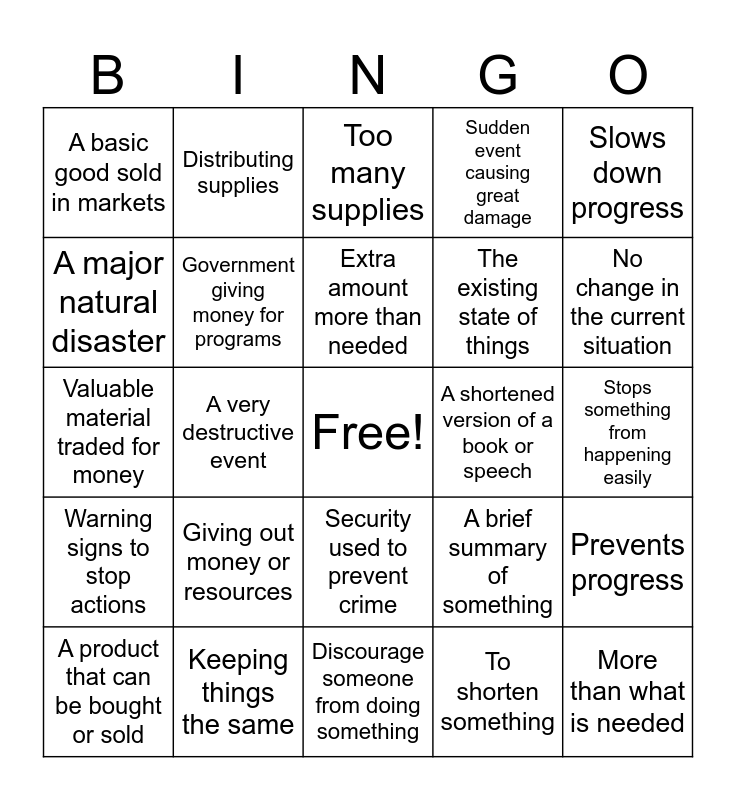 This bingo card has a free space and 24 words: A product that can be bought or sold, Giving out money or resources, Extra amount more than needed, To shorten something, Slows down progress, A basic good sold in markets, Distributing supplies, Too many supplies, A shortened version of a book or speech, Stops something from happening easily, Valuable material traded for money, Government giving money for programs, A brief summary of something, Prevents progress, A major natural disaster, Keeping things the same, Discourage someone from doing something, Sudden event causing great damage, No change in the current situation, Warning signs to stop actions, A very destructive event, Security used to prevent crime, The existing state of things and More than what is needed.