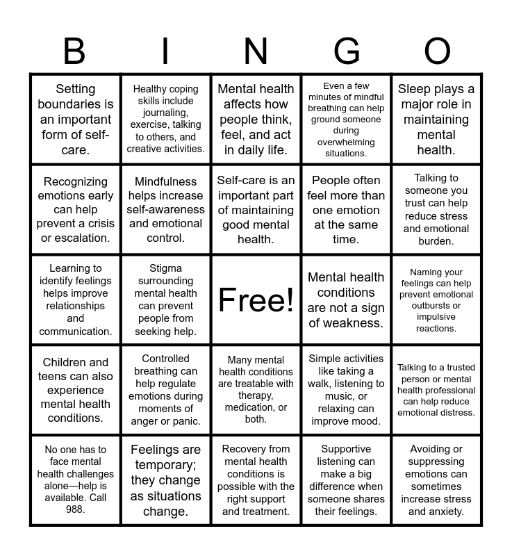 This bingo card has a free space and 41 words: Focusing on your breath can help interrupt racing or negative thoughts., Controlled breathing can help regulate emotions during moments of anger or panic., Practicing breathing exercises regularly can improve sleep quality., Even a few minutes of mindful breathing can help ground someone during overwhelming situations., Being present helps reduce rumination about the past and worry about the future., Children and teens can also experience mental health conditions., Mindfulness helps increase self-awareness and emotional control., Deep breathing can improve concentration and decision-making., Naming your feelings can help prevent emotional outbursts or impulsive reactions., Learning to identify feelings helps improve relationships and communication., Feelings are temporary; they change as situations change., Mental health affects how people think, feel, and act in daily life., People often feel more than one emotion at the same time., Avoiding or suppressing emotions can sometimes increase stress and anxiety., Recognizing emotions early can help prevent a crisis or escalation., Feelings are temporary; they change as situations change., Mental health and physical health are closely connected., Sleep plays a major role in maintaining mental health., Mindfulness, meditation, and relaxation techniques can help manage stress and anxiety., Healthy coping skills include journaling, exercise, talking to others, and creative activities., Self-care is an important part of maintaining good mental health., Simple activities like taking a walk, listening to music, or relaxing can improve mood., Relaxation techniques like stretching, meditation, or deep breathing can calm the body and mind., Setting boundaries is an important form of self-care., 1 in 5 adults in the United States experiences a mental health condition each year., Social support from friends, family, or peers can improve mental well-being., Early intervention and treatment often lead to better outcomes., Substance use and mental health conditions often occur together (co-occurring disorders)., Stigma surrounding mental health can prevent people from seeking help., Recovery from mental health conditions is possible with the right support and treatment., Mental health awareness helps reduce stigma and encourages people to seek help., Talking to someone you trust can help reduce stress and emotional burden., No one has to face mental health challenges alone—help is available. Call 988., Many mental health conditions are treatable with therapy, medication, or both., Mental health conditions are not a sign of weakness., Talking to a trusted person or mental health professional can help reduce emotional distress., Talking about your feelings can help reduce emotional stress and pressure., Peer support programs allow people with lived experience to help others in recovery., Honest conversations can help reduce misunderstandings and conflict., Supportive listening can make a big difference when someone shares their feelings. and Being open about mental health can encourage others to seek help too..