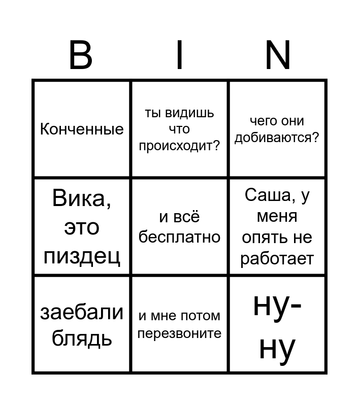 This bingo card has 9 words: заебали блядь, чего они добиваются?, ты видишь что происходит?, Вика, это пиздец, Конченные, Саша, у меня опять не работает, и всё бесплатно, ну-ну and и мне потом перезвоните.