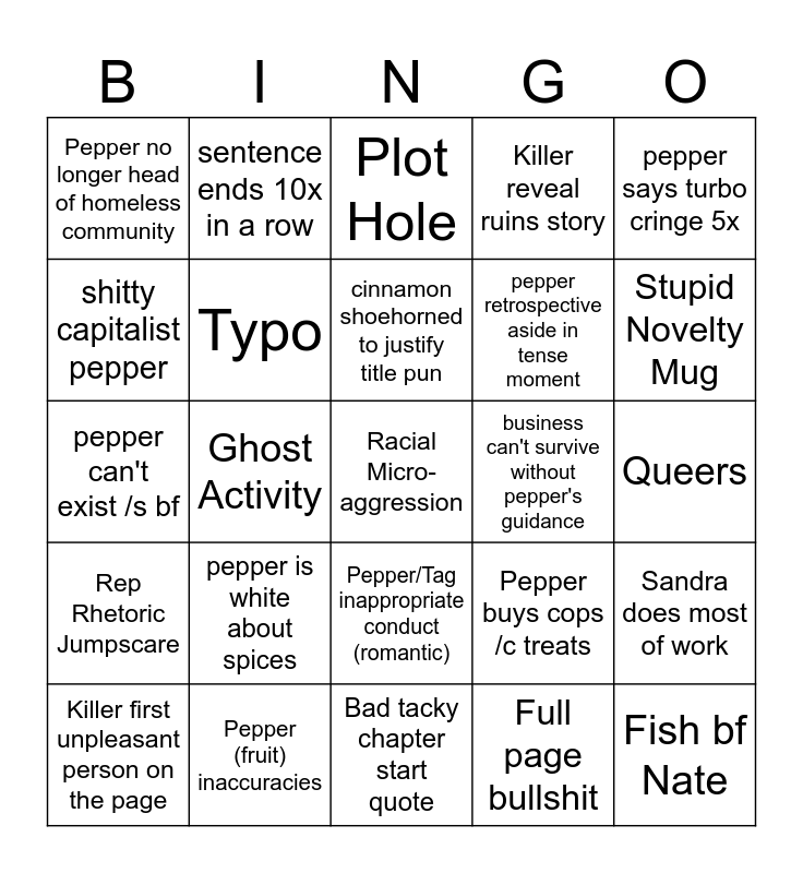 This bingo card has a free space and 24 words: pepper is white about spices, Pepper (fruit) inaccuracies, cinnamon shoehorned to justify title pun, Killer first unpleasant person on the page, pepper says turbo cringe 5x, Pepper no longer head of homeless community, shitty capitalist pepper, sentence ends 10x in a row, business can't survive without pepper's guidance, Pepper/Tag inappropriate conduct (romantic), pepper retrospective aside in tense moment, pepper can't exist /s bf, Pepper buys cops /c treats, Sandra does most of work, Typo, Full page bullshit, Queers, Plot Hole, Stupid Novelty Mug, Ghost Activity, Fish bf Nate, Rep Rhetoric Jumpscare, Killer reveal ruins story and Bad tacky chapter start quote.