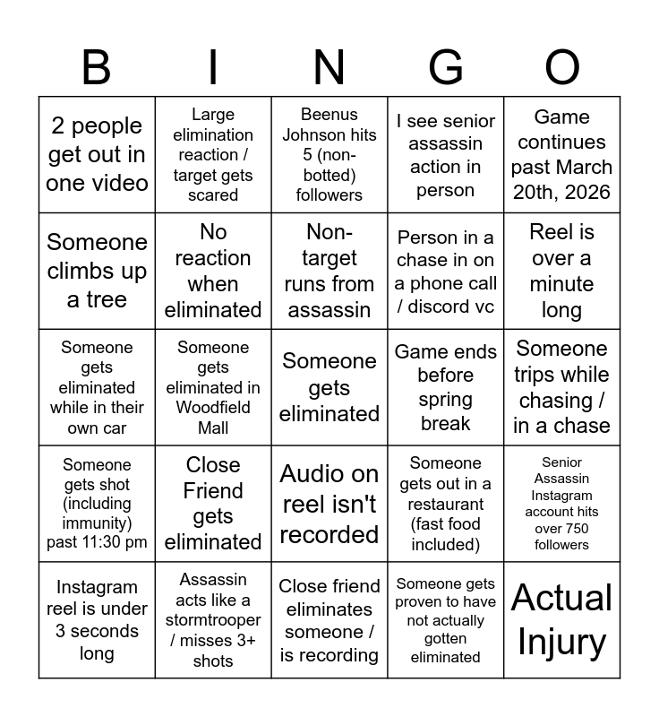 This bingo card has a free space and 24 words: Close Friend gets eliminated, Assassin acts like a stormtrooper / misses 3+ shots, Non-target runs from assassin, Instagram reel is under 3 seconds long, Game continues past March 20th, 2026, 2 people get out in one video, Someone climbs up a tree, Large elimination reaction / target gets scared, Game ends before spring break, Audio on reel isn't recorded, Person in a chase in on a phone call / discord vc, Someone gets eliminated while in their own car, Someone gets out in a restaurant (fast food included), Senior Assassin Instagram account hits over 750 followers, No reaction when eliminated, Someone gets proven to have not actually gotten eliminated, Someone trips while chasing / in a chase, Beenus Johnson hits 5 (non-botted) followers, Reel is over a minute long, Someone gets eliminated in Woodfield Mall, Actual Injury, Someone gets shot (including immunity) past 11:30 pm, I see senior assassin action in person and Close friend eliminates someone / is recording.