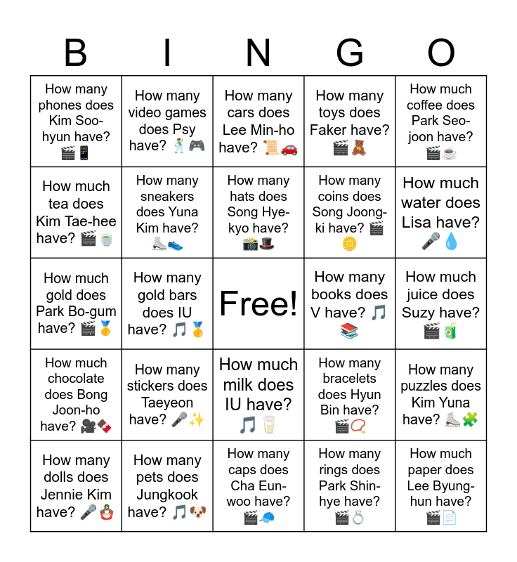 This bingo card has a free space and 33 words: How many Pokemon cards does Son Heung-min have? โฝ๐, How much money does BTS have? ๐ค๐ฐ, How many gold bars does IU have? ๐ต๐ฅ, How many comic books does Lee Jung-jae have? ๐ฌ๐, How much chocolate does Bong Joon-ho have? ๐ฅ๐ซ, How many sneakers does Yuna Kim have? โธ๏ธ๐, How much coffee does Park Seo-joon have? ๐ฌโ, How many dolls does Jennie Kim have? ๐ค๐ช, How many video games does Psy have? ๐บ๐ฎ, How much jewelry does Gong Yoo have? โ๐, How many hats does Song Hye-kyo have? ๐ธ๐ฉ, How many cars does Lee Min-ho have? ๐๐, How much rice does RM have? ๐ค๐, How many cameras does Jisoo have? ๐ฌ๐ท, How many books does V have? ๐ต๐, How much water does Lisa have? ๐ค๐ง, How many pets does Jungkook have? ๐ต๐ถ, How much gold does Park Bo-gum have? ๐ฌ๐ฅ, How many stickers does Taeyeon have? ๐คโจ, How many bracelets does Hyun Bin have? ๐ฌ๐ฟ, How much milk does IU have? ๐ต๐ฅ, How many marbles does Lee Seung-gi have? ๐ฌโช, How many phones does Kim Soo-hyun have? ๐ฌ๐ฑ, How much juice does Suzy have? ๐ฌ๐ง, How many caps does Cha Eun-woo have? ๐ฌ๐งข, How much paper does Lee Byung-hun have? ๐ฌ๐, How many toys does Faker have? ๐ฌ๐งธ, How many coins does Song Joong-ki have? ๐ฌ๐ช, How much tea does Kim Tae-hee have? ๐ฌ๐ต, How many puzzles does Kim Yuna have? โธ๏ธ๐งฉ, How much chocolate does Taemin have? ๐ต๐ซ, How many rings does Park Shin-hye have? ๐ฌ๐ and How many posters does Lee Dong-wook have? ๐ฌ๐ผ๏ธ.