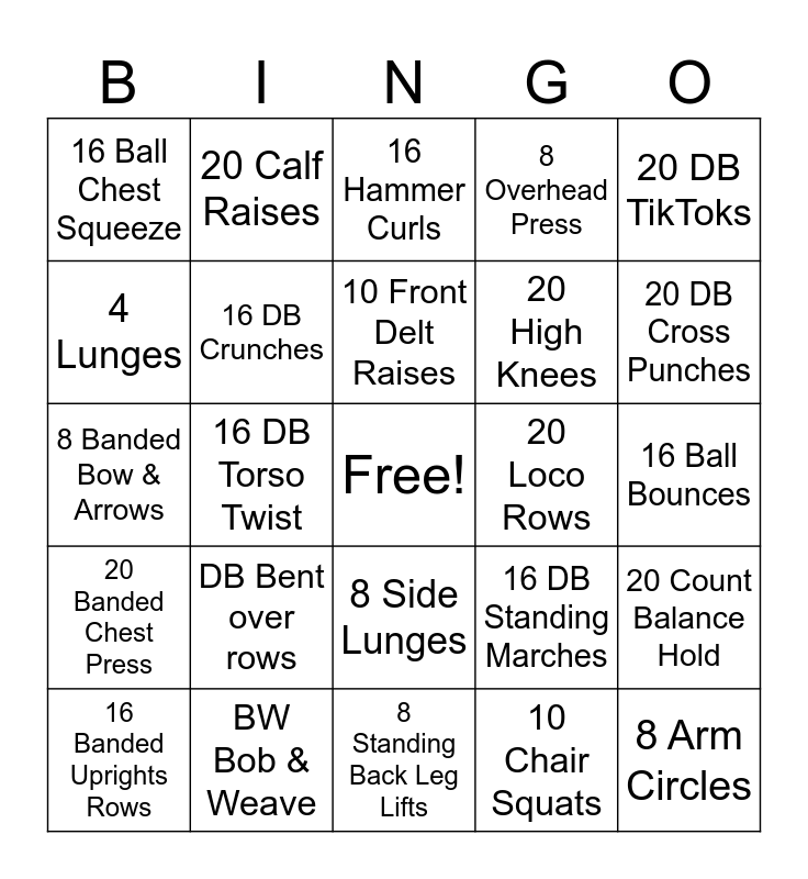 This bingo card has a free space and 34 words: 16 Bicep Curls, 10 Chair Squats, 16 Tricep Kickbacks, 20 Loop Band Butterflies, 20 Banded Chest Press, 16 DB Crunches, 20 DB TikToks, 16 Banded Uprights Rows, 20 Calf Raises, 20 Banded Chest Flys, 10 Front Delt Raises, 16 Hammer Curls, 10 Demi Squats, 8 Single Arm Loop Band Tricep Press Down, 20 Loco Rows, 20 DB Cross Punches, BW Bob & Weave, 8 Banded Bow & Arrows, DB Bent over rows, 16 DB Standing Marches, 8 Side Lunges, DB Seated Deadlift, 16 Ball Chest Squeeze, 16 Ball Bounces, 8 Standing Back Leg Lifts, 8 Arm Circles, 8 Overhead Press, 10 Wall Push-Ups, 20 High Knees, 4 Lunges, 20 Alt Seated Elbow To Knee, 16 DB Torso Twist, 20 Count Balance Hold and 20 Alt Fwd Kick.