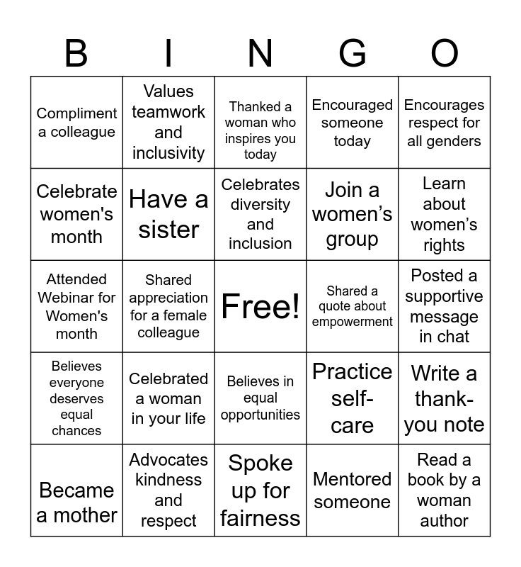 This bingo card has a free space and 24 words: Became a mother, Celebrated a woman in your life, Celebrates diversity and inclusion, Mentored someone, Encourages respect for all genders, Compliment a colleague, Values teamwork and inclusivity, Thanked a woman who inspires you today, Shared a quote about empowerment, Posted a supportive message in chat, Attended Webinar for Women's month, Have a sister, Practice self-care, Write a thank-you note, Celebrate women's month, Advocates kindness and respect, Spoke up for fairness, Encouraged someone today, Learn about women’s rights, Believes everyone deserves equal chances, Shared appreciation for a female colleague, Believes in equal opportunities, Join a women’s group and Read a book by a woman author.
