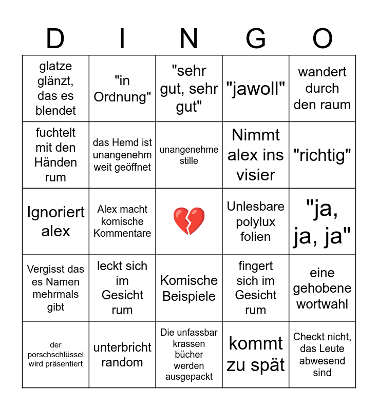 This bingo card has a free space and 24 words: leckt sich im Gesicht rum, unterbricht random, unangenehme stille, der porschschlüssel wird präsentiert, wandert durch den raum, glatze glänzt, das es blendet, fuchtelt mit den Händen rum, "in Ordnung", Unlesbare polylux folien, Komische Beispiele, Nimmt alex ins visier, Ignoriert alex, fingert sich im Gesicht rum, eine gehobene wortwahl, das Hemd ist unangenehm weit geöffnet, kommt zu spät, "ja, ja, ja", "sehr gut, sehr gut", "richtig", Alex macht komische Kommentare, Checkt nicht, das Leute abwesend sind, Vergisst das es Namen mehrmals gibt, "jawoll" and Die unfassbar krassen bücher werden ausgepackt.