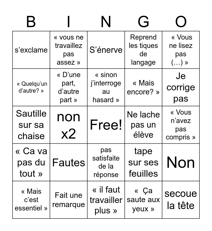 This bingo card has a free space and 24 words: Fautes, Fait une remarque, « sinon j’interroge au hasard », « Mais c’est essentiel », « Vous ne lisez pas (…) », s’exclame, « Quelqu’un d’autre? », « vous ne travaillez pas assez », Ne lache pas un élève, pas satisfaite de la réponse, « Mais encore? », Sautille sur sa chaise, tape sur ses feuilles, Non, « D’une part, d’autre part », « Ça saute aux yeux », « Vous n’avez pas compris », S’énerve, Je corrige pas, non x2, secoue la tête, « Ca va pas du tout », Reprend les tiques de langage and « il faut travailler plus ».