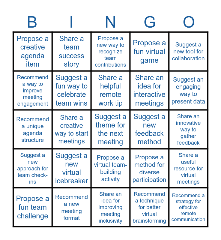 This bingo card has a free space and 24 words: Suggest a new virtual icebreaker, Recommend a new meeting format, Share a helpful remote work tip, Propose a fun team challenge, Suggest a new tool for collaboration, Propose a creative agenda item, Recommend a way to improve meeting engagement, Share a team success story, Suggest a new feedback method, Propose a virtual team-building activity, Share an idea for interactive meetings, Recommend a unique agenda structure, Propose a method for diverse participation, Share a useful resource for virtual meetings, Suggest a fun way to celebrate team wins, Recommend a technique for better virtual brainstorming, Share an innovative way to gather feedback, Propose a new way to recognize team contributions, Suggest an engaging way to present data, Share a creative way to start meetings, Recommend a strategy for effective remote communication, Suggest a new approach for team check-ins, Propose a fun virtual game and Share an idea for improving meeting inclusivity.