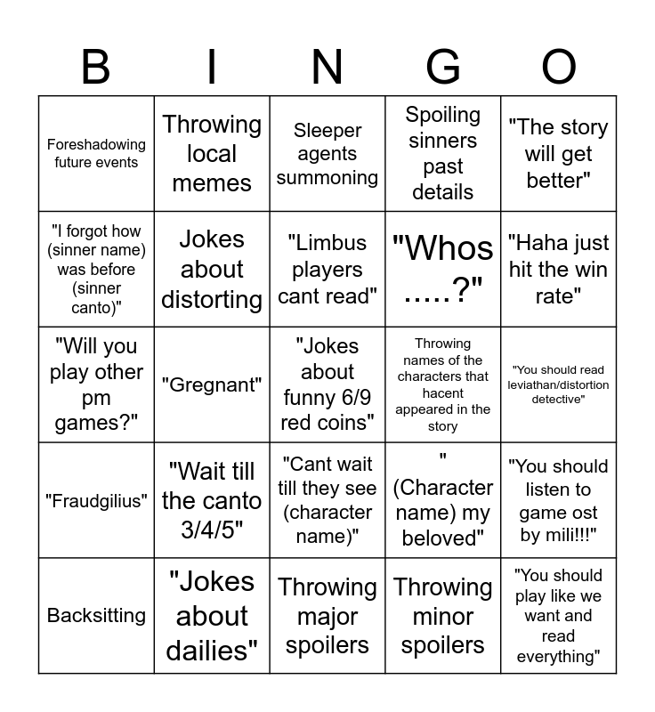 This bingo card has 25 words: "Wait till the canto 3/4/5", Throwing major spoilers, "Limbus players cant read", Backsitting, "The story will get better", Foreshadowing future events, "I forgot how (sinner name) was before (sinner canto)", Throwing local memes, Throwing names of the characters that hacent appeared in the story, "Cant wait till they see (character name)", "Whos .....?", "Will you play other pm games?", "(Character name) my beloved", "You should listen to game ost by mili!!!", Jokes about distorting, "You should play like we want and read everything", "You should read leviathan/distortion detective", Sleeper agents summoning, "Haha just hit the win rate", "Gregnant", "Jokes about funny 6/9 red coins", "Jokes about dailies", "Fraudgilius", Spoiling sinners past details and Throwing minor spoilers.