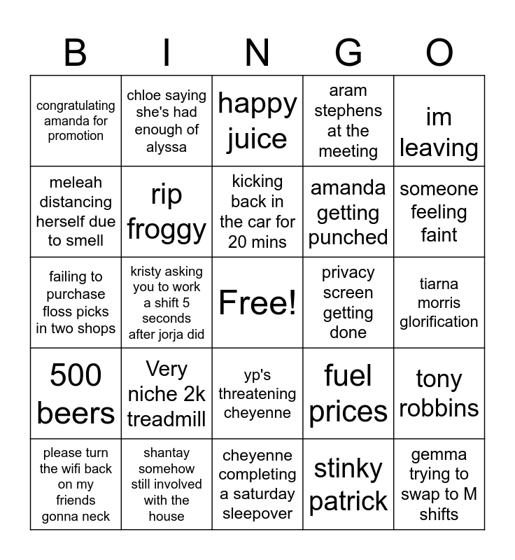 This bingo card has a free space and 24 words: Very niche 2k treadmill, shantay somehow still involved with the house, kicking back in the car for 20 mins, please turn the wifi back on my friends gonna neck, im leaving, congratulating amanda for promotion, meleah distancing herself due to smell, chloe saying she's had enough of alyssa, privacy screen getting done, yp's threatening cheyenne, amanda getting punched, failing to purchase floss picks in two shops, fuel prices, tony robbins, rip froggy, stinky patrick, tiarna morris glorification, happy juice, someone feeling faint, kristy asking you to work a shift 5 seconds after jorja did, gemma trying to swap to M shifts, 500 beers, aram stephens at the meeting and cheyenne completing a saturday sleepover.